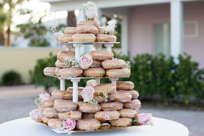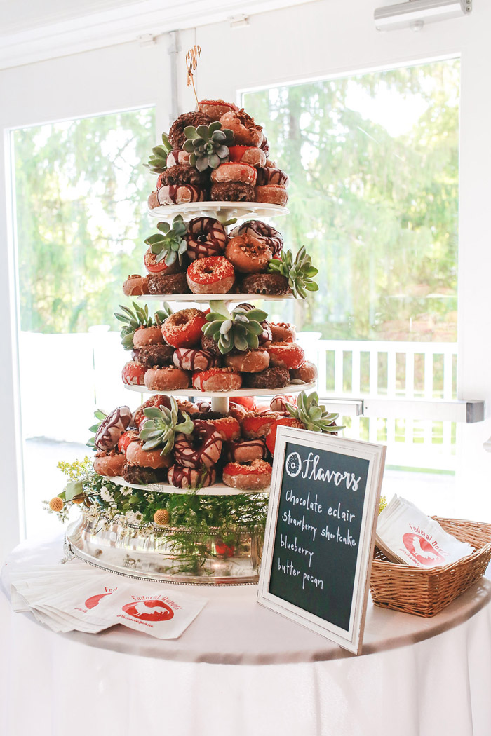 Creating a sky-high donut stack is a playful take on the traditional wedding cake. With so many delicious flavour combinations available, the choices are endless! Not to mention, they are super easy to serve to guests.