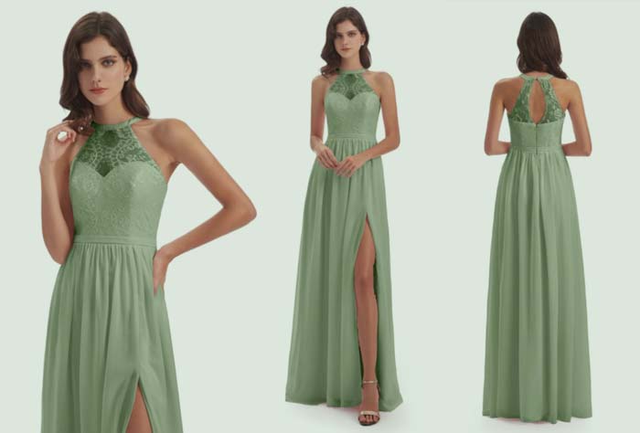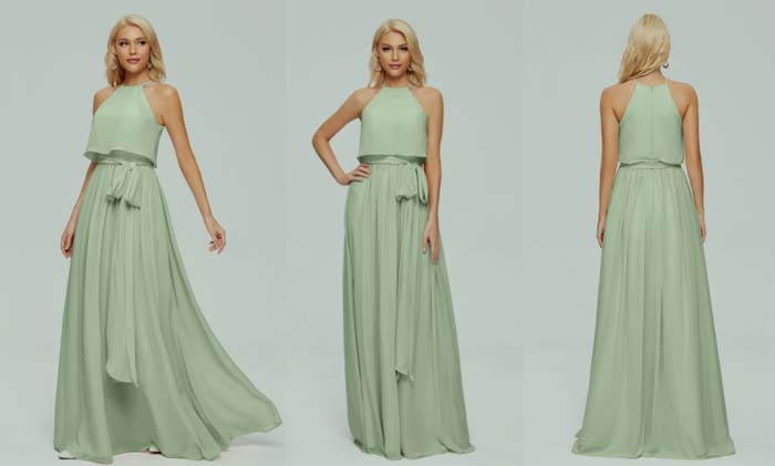 This dress is perfect for the casual bride who wants her bridesmaids to look stylish but comfortable enough to dance all night. The fabric will keep your bridesmaids cool and dry no matter how much dancing they do. It has a halter neckline and spaghetti straps that add a touch of elegance to the style without being too revealing. This design is available in two other colors: dusty rose and seafoam green.