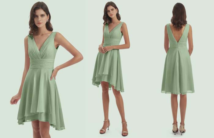 This knee-length bridesmaid dress is cute and flirty with an asymmetrical hemline. It also comes in two other colors: dusty rose and seafoam green. The chiffon fabric will keep your bridesmaids cool on the hottest wedding day, meaning they can party all night long without feeling uncomfortable.
