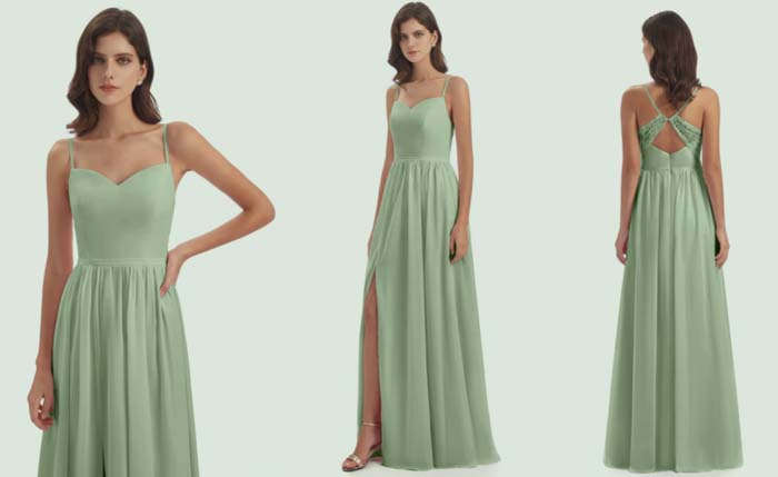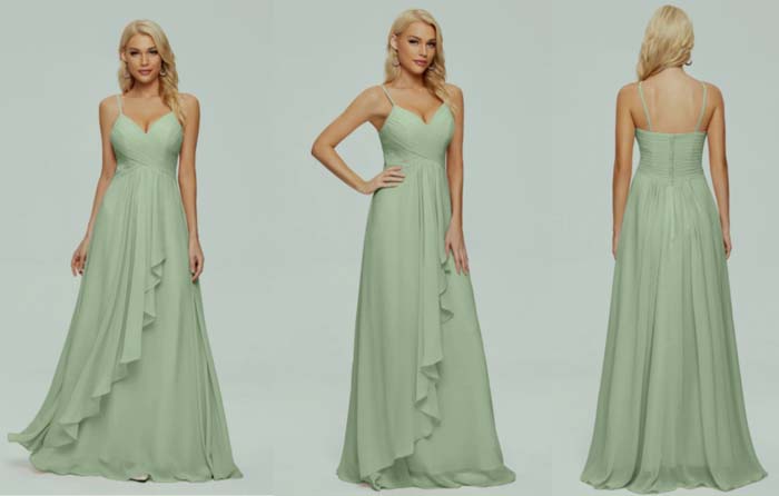 This dress is very flattering and comes in a gorgeous sage color. It features an asymmetrical hemline and thin spaghetti straps. The best part about this bridesmaid dress is that it can be worn again as a party dress or to formal events like weddings after the wedding day has passed. This style also comes in dusty rose, light coral, and seafoam green.