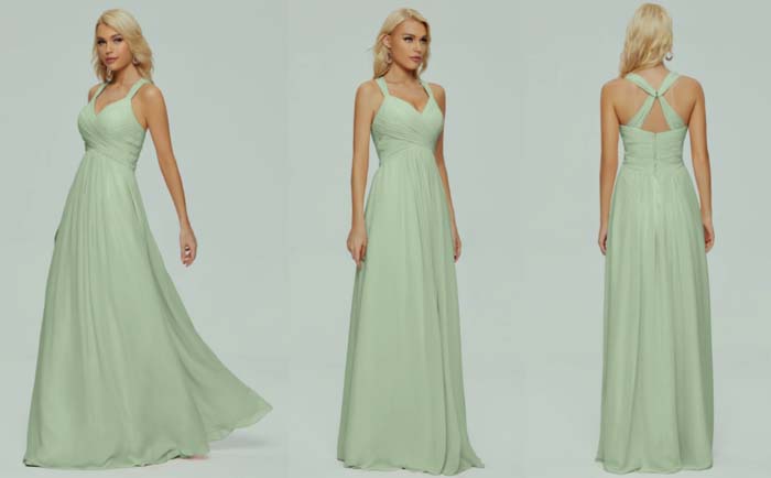 This dress is sophisticated and so beautiful. The dress is a good length and an excellent relaxed fit. This style will work well at many different venues, from a city hall wedding to a destination beach resort wedding. The fabric is chiffon, so be sure that it doesn’t get too hot in the sun. This dress is perfect for the girl who wants to start her wedding day with some color but does not overwhelm the bride’s vision for muted colors. The dress has an asymmetrical hemline and spaghetti straps. It will be sure to flatter every bridesmaid, no matter her body type. The dress is available dusty rose, powder blue, seafoam green, and buttercup yellow.