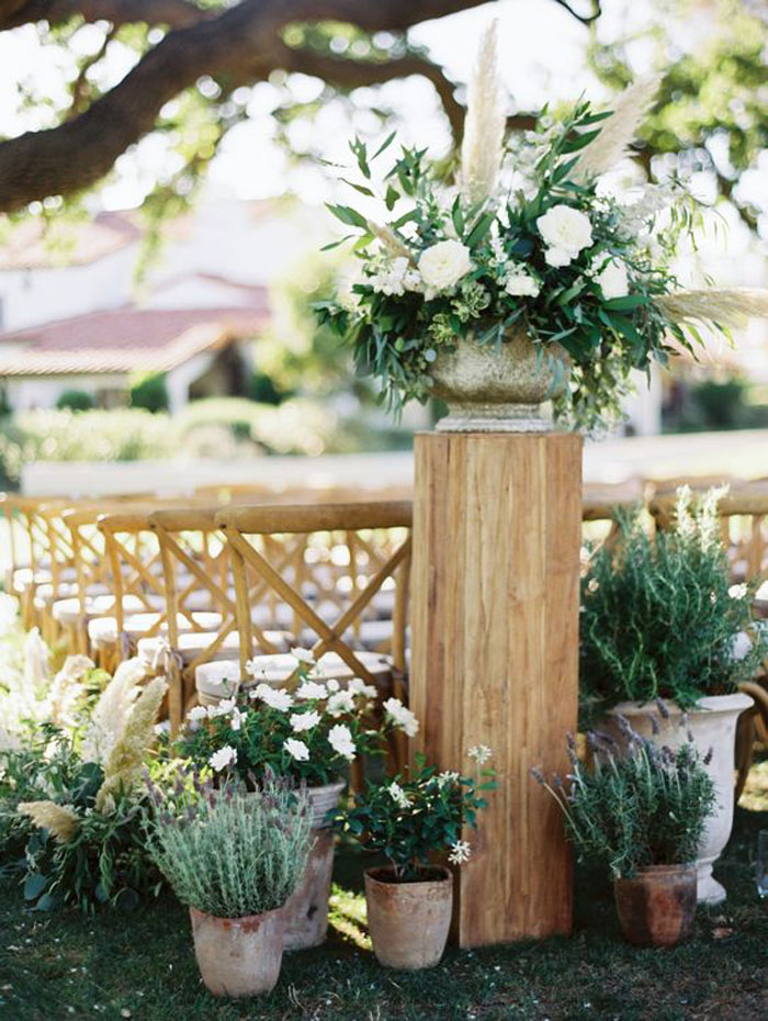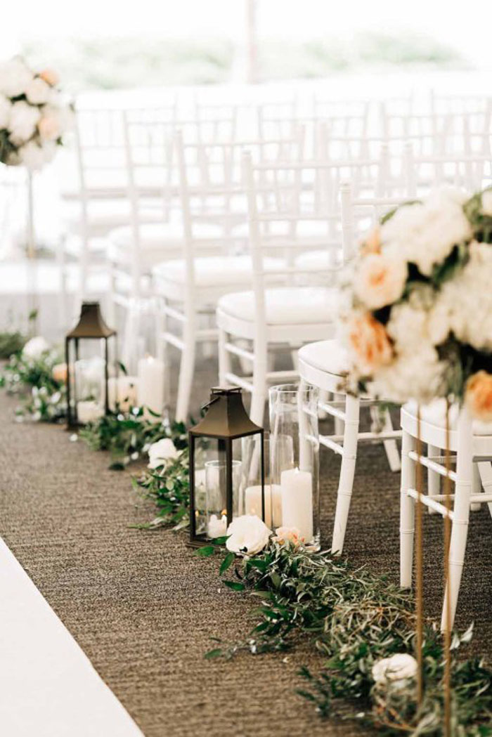 Consider incorporating small potted flowers or herbs into the aisle décor to add an organic touch to any garden or indoor wedding. Think about alternating pops of colour with greenery to create a lush and beautiful aisle.