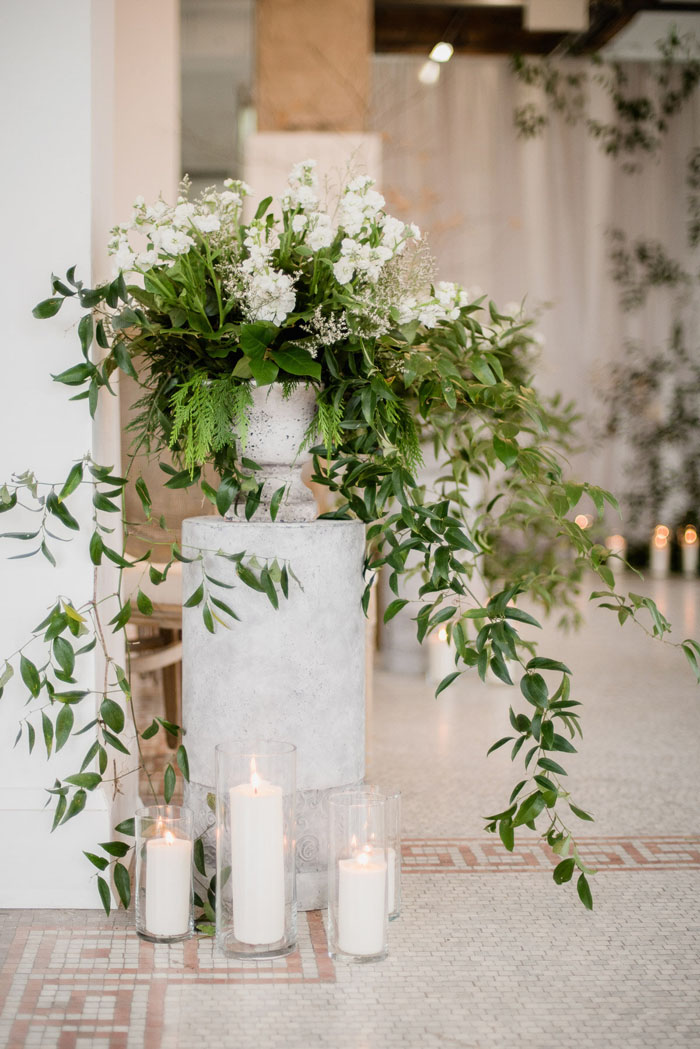 Small floral arrangements are an elegant way to create a dramatic look. Consider incorporating flowers that match the bridal bouquets to create a cohesive style. Tip: these also can double as the table arrangements at the reception in order to keep floral costs down. #thrifty