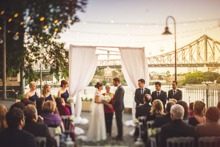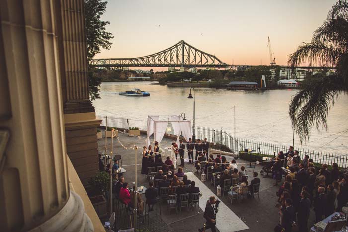 Our ceremony was held on the Riverside Terrace at Customs House right on sunset. The set up was perfect, we had fairy lights overhead and chandelier under our arbour with the Story bridge as the background. We had an image in our minds of what we wanted and our wedding stylist made it happen. We also had a string trio with a solo guitarist for the music.