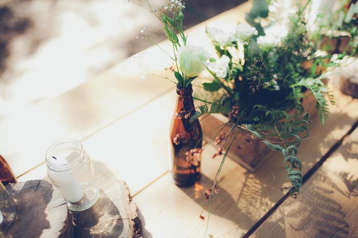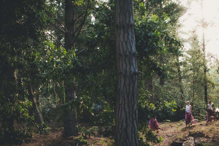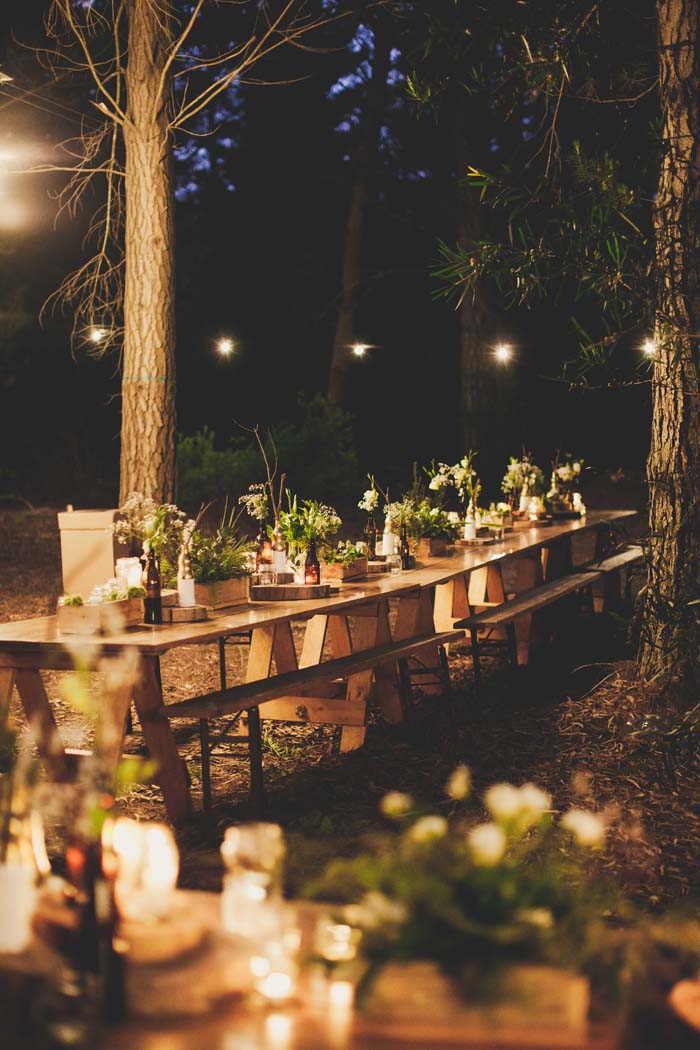 We created a little pocket in the woods for couches and carpets. I loved the idea of having a full blown lounge in the middle of a forest. We had only long wooden tables and benches for seating and built a teepee out of long wooden poles with the tips painted white held together by ivy and greenery as an entrance to the wedding.