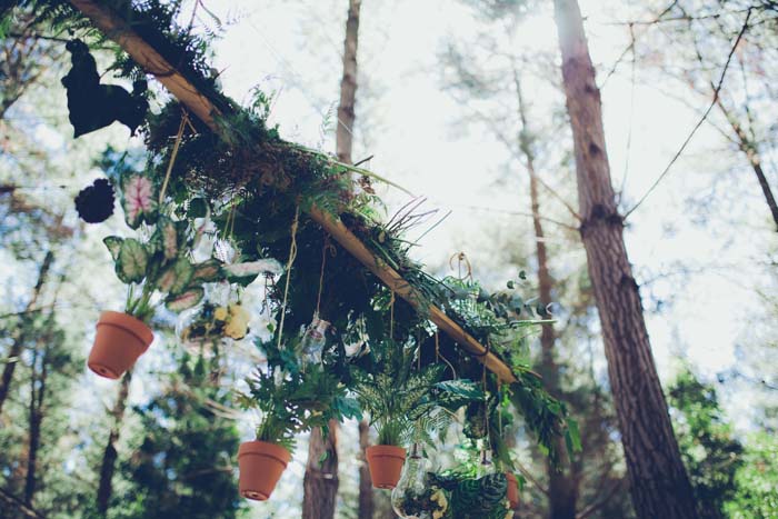 We put white flowers in big glass hanging bulbs that were strung up in-between hanging pot plants in terra-cotta pots and hung bouquets of flowers from the trees and signage. I hand-painted all signage on wooden boards. We had bistro bulb string lighting strung throughout the forest and had three areas in the forest of grouped big vintage bulbs hanging down from black cords.