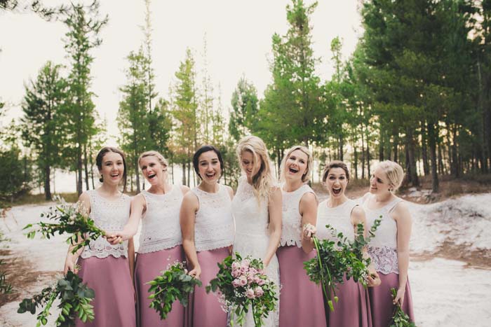I had six bridesmaids and Wessel had nine groomsmen. They were made up of the people we do life with. The maids wore various white lace tops with matching high waisted dusty pink/purple flowing skirts.