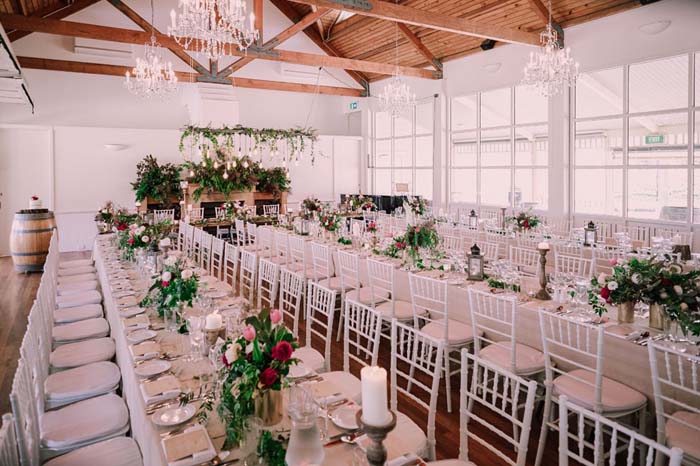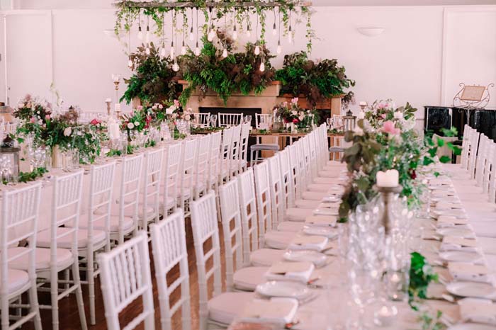 Aimee: The Wedding Designers decorated our reception. Matt and I had 3 wishes for decoration (as well as showing the stylist/florist/graphics designer images of the style we were after) which were: Over-the-top greenery and florals, Garden Party and Festoon Lighting. The colours were chose were greens, whites/creams/pale pinks and deep red. We had pictures of our parents and grandparents on their wedding day displayed as well as a picture of myself and my late mother. We also had thank you cards for each guest for being such a special part in our life and making us who we are today.