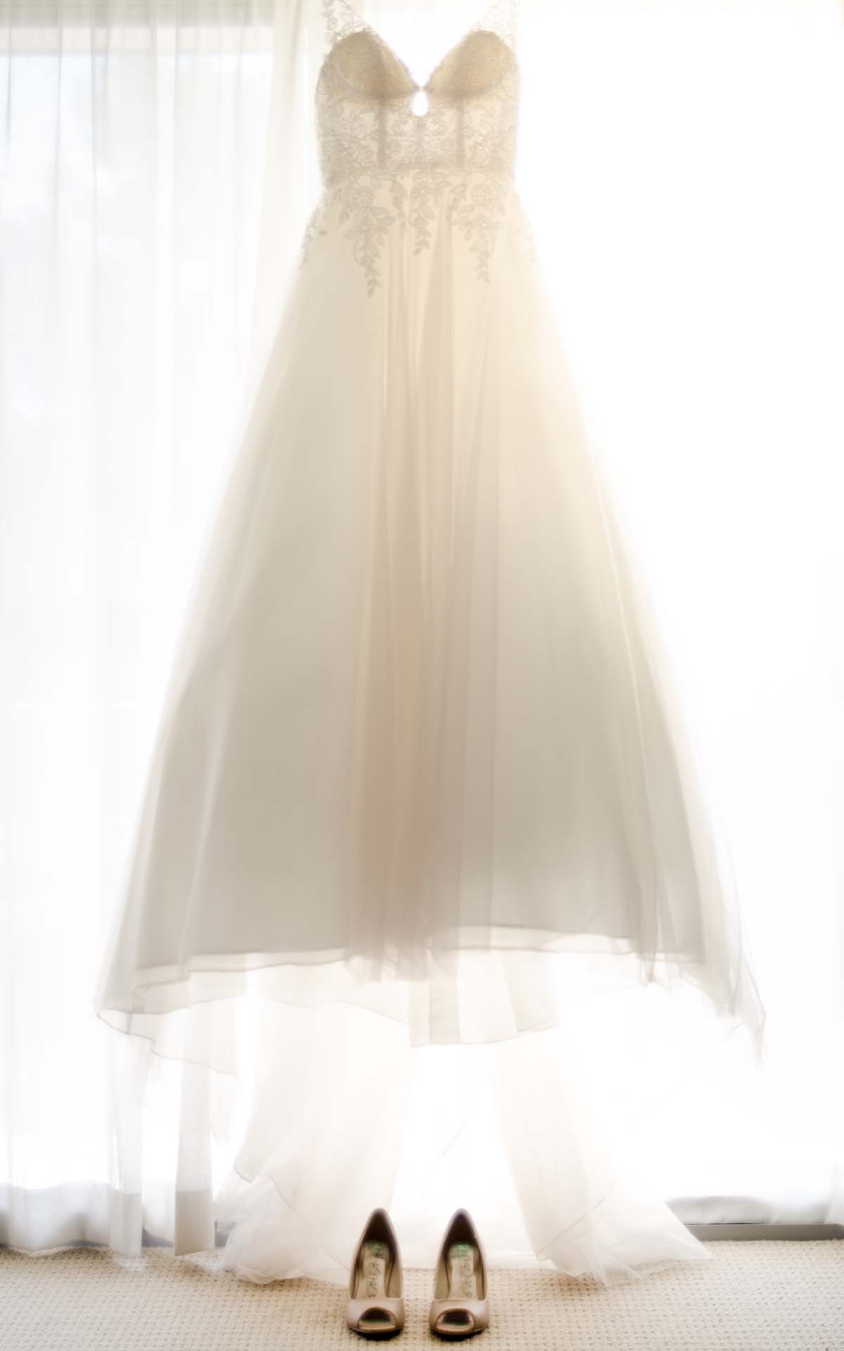 Spaghetti strap with leafy detail on the bodice, then a full skirt with lots of tulle. It’s Stella York from Belles and Beaux and I was lucky they could get it in in time for the wedding! It was not at all what I expected I’d get. I had an idea of sleek mermaid cut but was open to try anything. My stepmum actually picked it out and as soon as I tried it on we all knew it was the one!