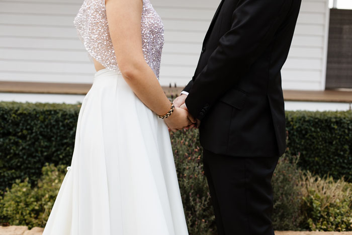 As a nurse at Sunshine Emergency Department, Amanda was very aware of how important it was for everyone to stay safe during these times. So, she and Matt knew they needed to rethink their wedding plans. “Our wedding went from a wild, joyous expression of our love to requiring us to be adaptable,” shares the bride. The pair quickly went back to the drawing board because they knew they weren’t going to postpone their nuptials. “If the big wedding wasn’t going to happen, that was okay,” says Amanda. “I ended up planning four weddings on the same day with a different lockdown stage in mind so that we could be prepared for any circumstance.”