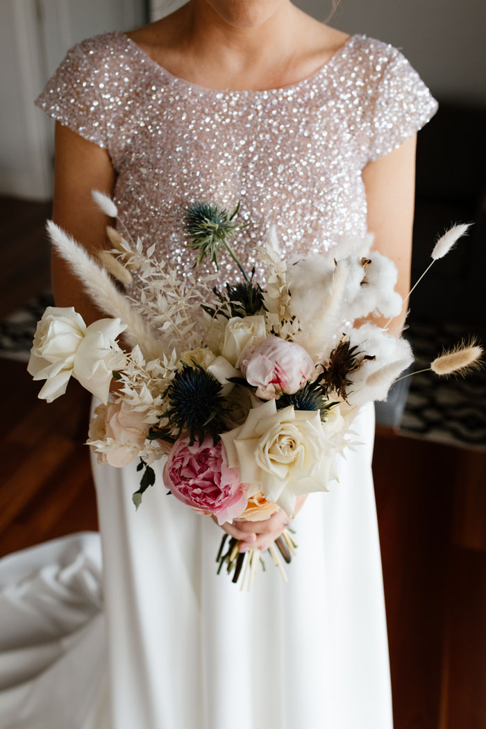 Amanda channeled a glamorous modern bride vibe with her wedding day look! She wore a stunning Anna Campbell two-piece gown which featured a pink champagne top with hand-beaded sparkling sequinned tulle and a daring open back. “It was a spectacular dress and as soon as I put it on. I knew that it was my perfect dress.” gushes Amanda. The look was completed with a stunning full-length ivory skirt and a bridal bouquet which exuded romantic Scandinavian vibes with a soft, blush colour scheme.