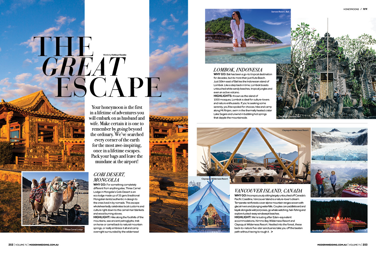 Break away from the wedding norm with the Escape edition of Modern Wedding Magazine (vol 71). We bring you the greatest ideas to inspire your wedding escape – from the latest in destination weddings and honeymoons, to creating an elaborate escape at your reception to tips and tricks for exceeding expectations for your wedding!