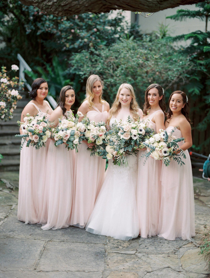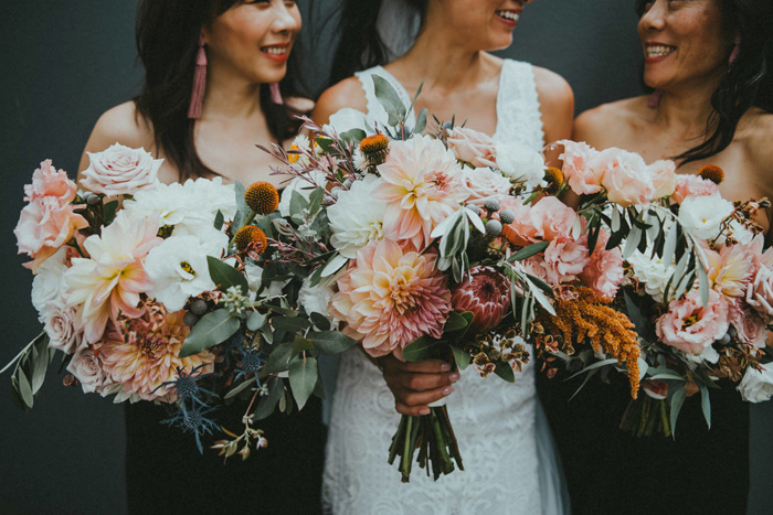We love a bouquet that champions unique blooms and daring colour tones. These gorgeously crafted bouquets feature blush pink dahlias and proteas with sage-toned greenery to achieve a look that is striking and luscious. Be inspired by this bouquet to create a statement look that is whimsical and bold.