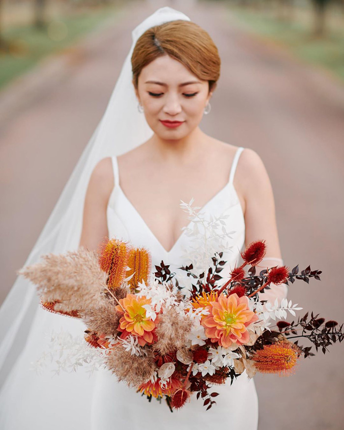 Be inspired by this daring combination of warm toned florals. Make a statement on your wedding day with this striking bunch of native Australian beauties. The woolly orange banksia, orange asters and proteas showcase the most vibrant colours, with a finishing touch of feathery detail. This bouquet pays tribute to the stunning natural beauty of Australia and is perfect all year round.