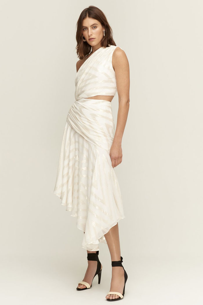 Turn heads in this uber-chic one-shoulder dress! With a draped silk metallic jacquard design and daring cut out detail at the waist, this look is perfect for the bride who wants to make a statement on her big day.