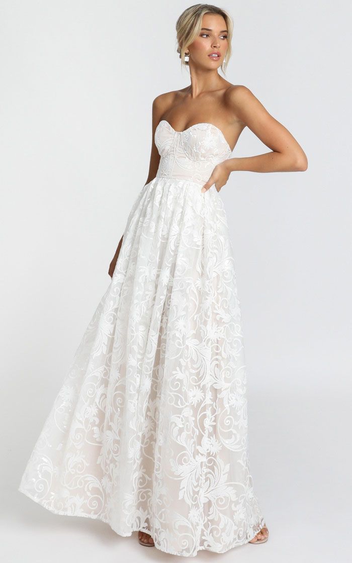 Bring the class to your chilled out garden wedding with this heavenly wedding gown. Featuring intricately embroidered and sequinned fabric paired with a romantic full-length skirt, this gown is truly breathtaking. Plus, the sweetheart neckline and fitted bodice will accentuate your figure and serve as a flattering fit for all body types.