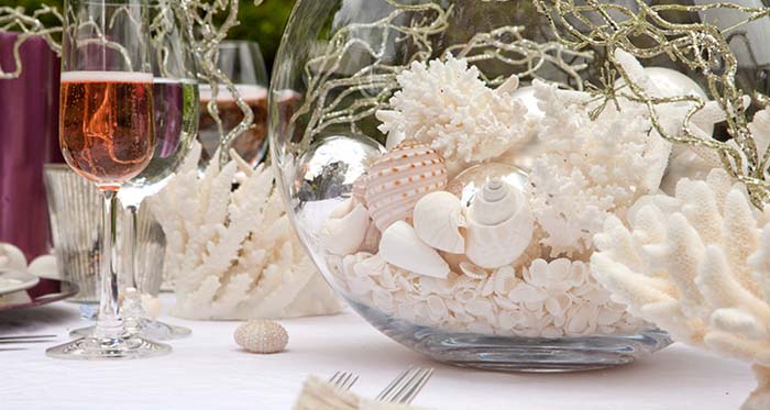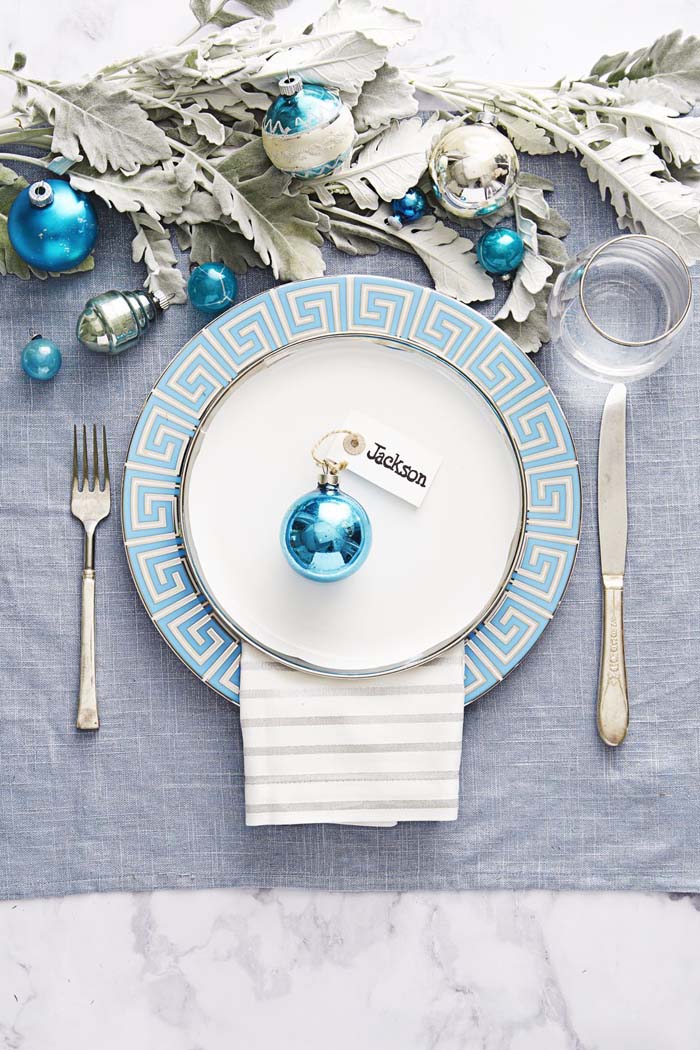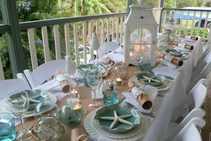 While a coastal themed table is less Christmas inspired, the cool colour scheme and relaxed vibe can be easily adapted to reflect the Christmas spirit. Pearl, white and silver compliment blue beach tones. Fill a bowl with some sand and top with shells and baubles in matching colours to combine the Christmas and coastal vibes. A linen tablecloth or hessian table runner will tie the whole look together. Similarly, glassware can be kept simple, as clear glasses further enhance the relaxed, beach inspired theme.