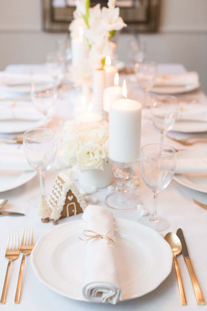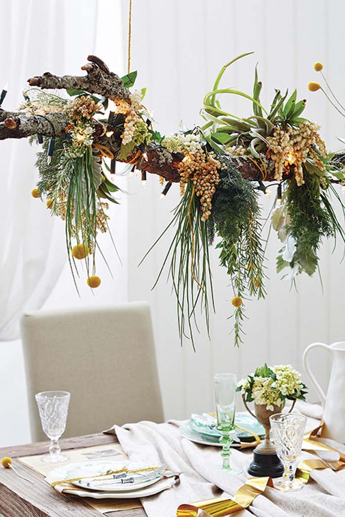 The table itself is not the only thing that completes your Christmas table styling look. Add some extra styling features by using the space above the table. If the lights above your table allow it, decorating them with greenery to match your table is a great way to extend your styling beyond the table and offer a complete design. Additionally, if there is room to hang something above your table, there are plenty more styling options. Using a hook and some ribbon, a wreath can be simply suspended above the table. For a more spectacular hanging centrepiece, hang a bough and decorate it with the same foliage and flowers used on your table.