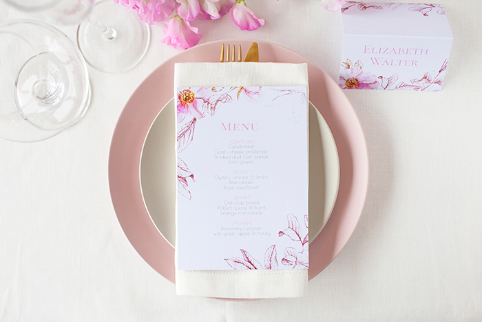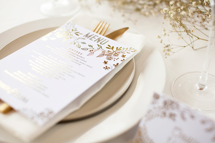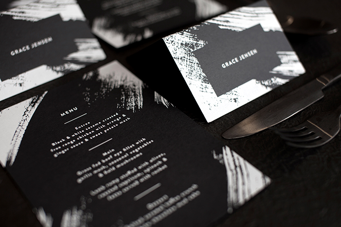 Sticking to a black and white colour palette is a great way to achieve a chic, sophisticated look that is easy to work into your wedding as a whole. Monochrome is effective for your on-the-day stationery regardless of how you choose to decorate. If you’re keeping everything simple, monochrome stands alone as a strong feature. If you’ve got a lot of decor planned, the simplicity of black and white helps prevent clashing colours or too much busy-ness. White ink on black paper is a particularly popular way of achieving this look, but simple dark ink on white paper or the more involved process of white foil on black paper can also be used for a similar effect.