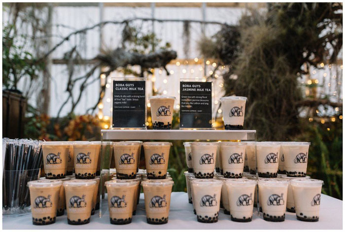 When you’re planning a stand-out wedding dinner, it’s also important to consider which drinks will accompany your meal. If you want to bring a touch of fun to your wedding menu, treat yo’ self to some delicious bubble teas! This is such a fun beverage to serve your guests, especially if you’re tying the knot in the summer sunshine.
