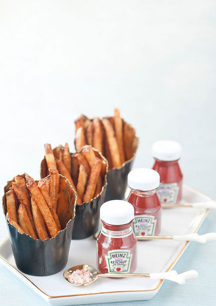 If you’re opting for a sit-down meal but don’t want to serve a meal that will leave your guests feeling totally stuffed, sweet potato fries are a great option! They’re delicious and filling without being too heavy and can be served in a range of adorable ways.