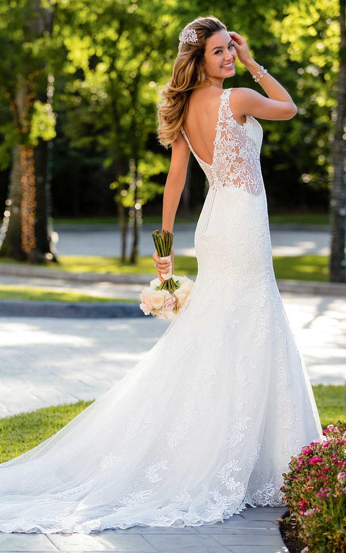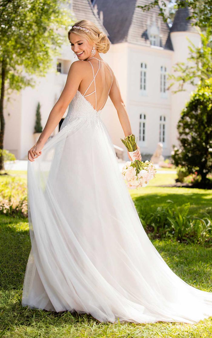 “X” marks the spot on these wedding dresses. From double beaded back straps, to tiny tie-ups and shoestring straps, these dresses offer a unique take on bridal. Flirty micro straps add a touch of boho, while dramatic beaded bands give off a hint of glamour.