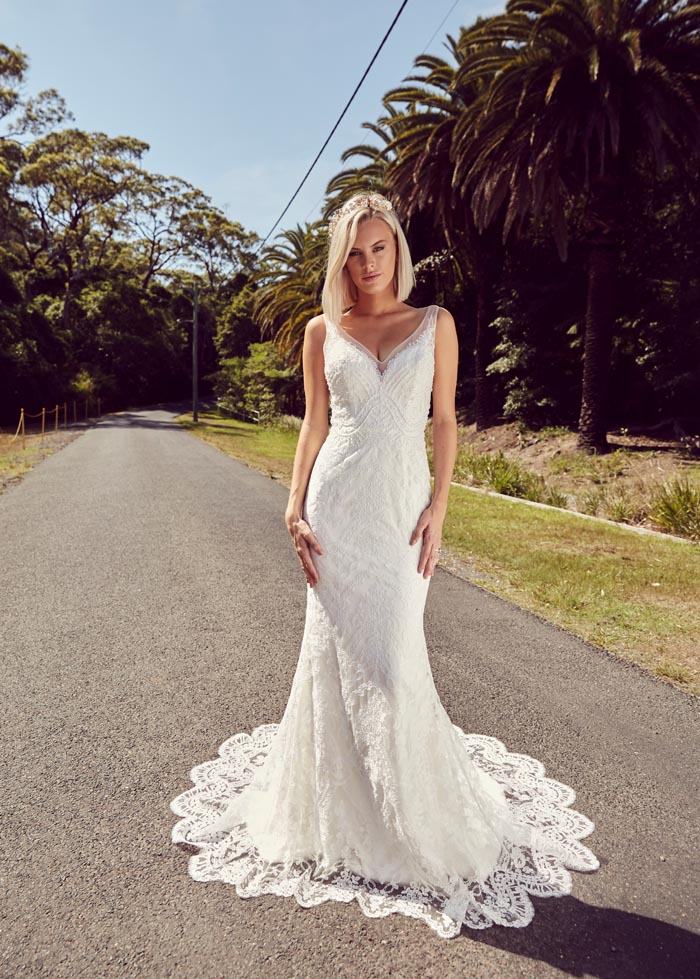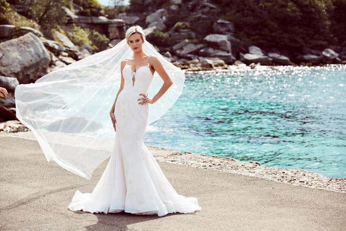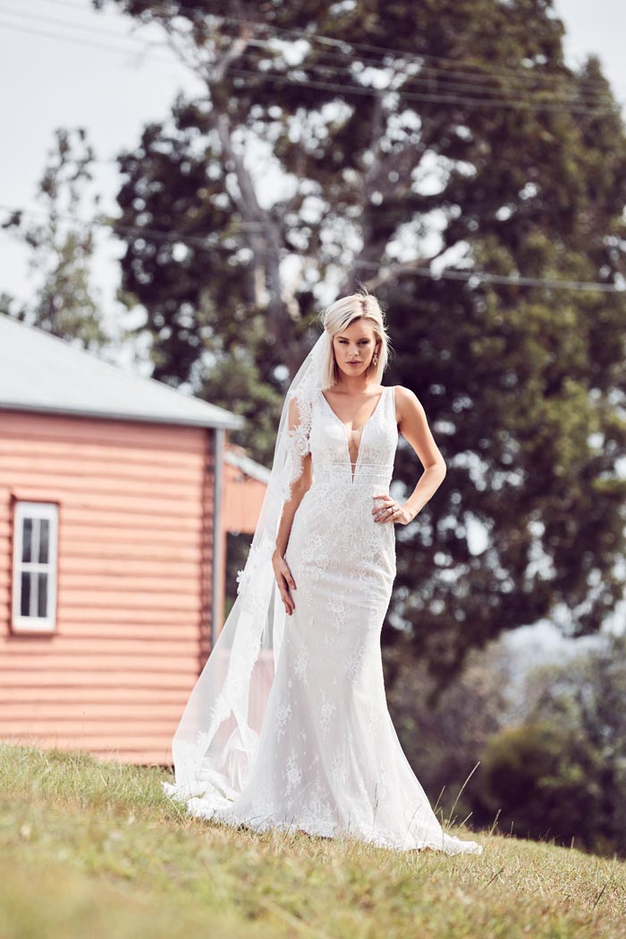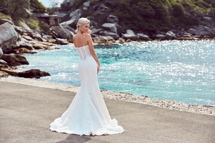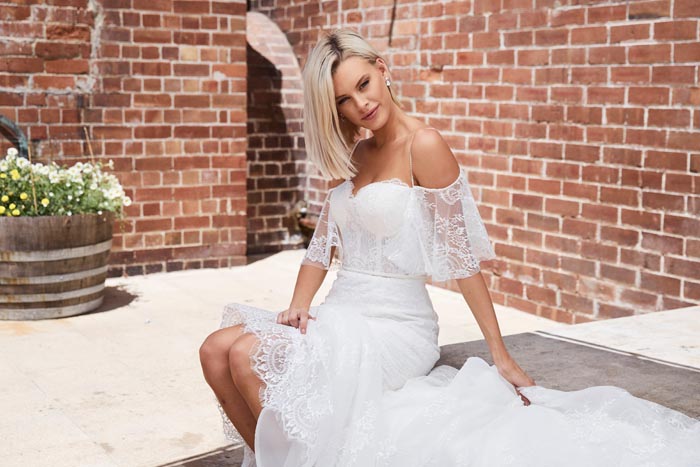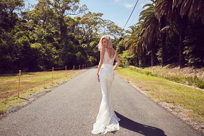 The gowns are ethereal, ultra feminine with a nod to yesteryear. Lace and intricate Chantilly feature strongly, with boned corsets and bustiers. The feminine features are contrasted with sexy low backs, flouncy off the shoulder sleeves and sheer bodices to give a modern day twist.