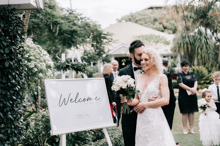 After a beautiful Gold Coast wedding ceremony, the celebrations moved to Bumbles Cafe on Budds Beach. “We loved our reception venue because it had such a unique character with books, photo frames, candles and vases decorating each section of the cafe,” gushes Emma. Bumbles Cafe offered a totally unique space so Emma and Daniel kept their reception décor refined with elegant black and white theming. “We added long tables with white coverings and napkins, black and white signage as well as white flower arrangements,” shares Emma. The reception styling was elevated by enchanting details such as striking green foliage in mason jars and beautiful white pillar candles in glass cylinder holders.