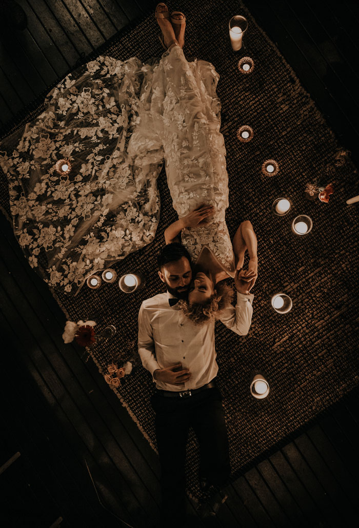 Emma and Daniel’s magical day was captured by Bird And Boy Photography. “We chose Bird And Boy Photography because we loved their natural styling,” explains Emma, “They really guided us and captured the natural emotions of our special day so well”. Emma and Daniel both agree that one of their favourite memories from the big day happened at the hands of their amazing photographers. On the back deck of Bumble Cafes, their photographers styled a beautiful scene using a cosy rug, flower vases and candles, and during the reception, they led the newlyweds outside to enjoy a special moment of serenity. “It was so special to be able to enjoy a few minutes together amidst the wedding mayhem so we made sure to hold hands, close our eyes and soak up the moment,” shares Emma.