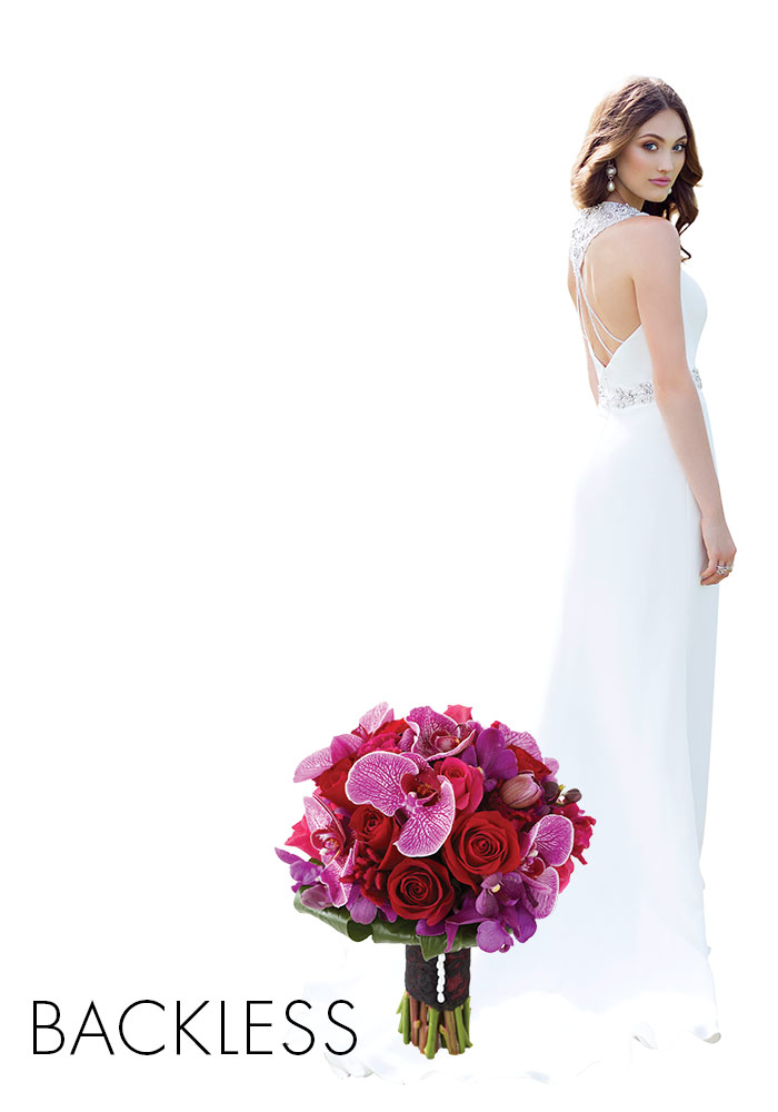 A backless dress is dramatic and commands attention hence your bouquet needs to be as striking and impressive as the back of your gown. A contemporary bouquet made from exotic blooms in rich, intense colours will balance the look beautifully.