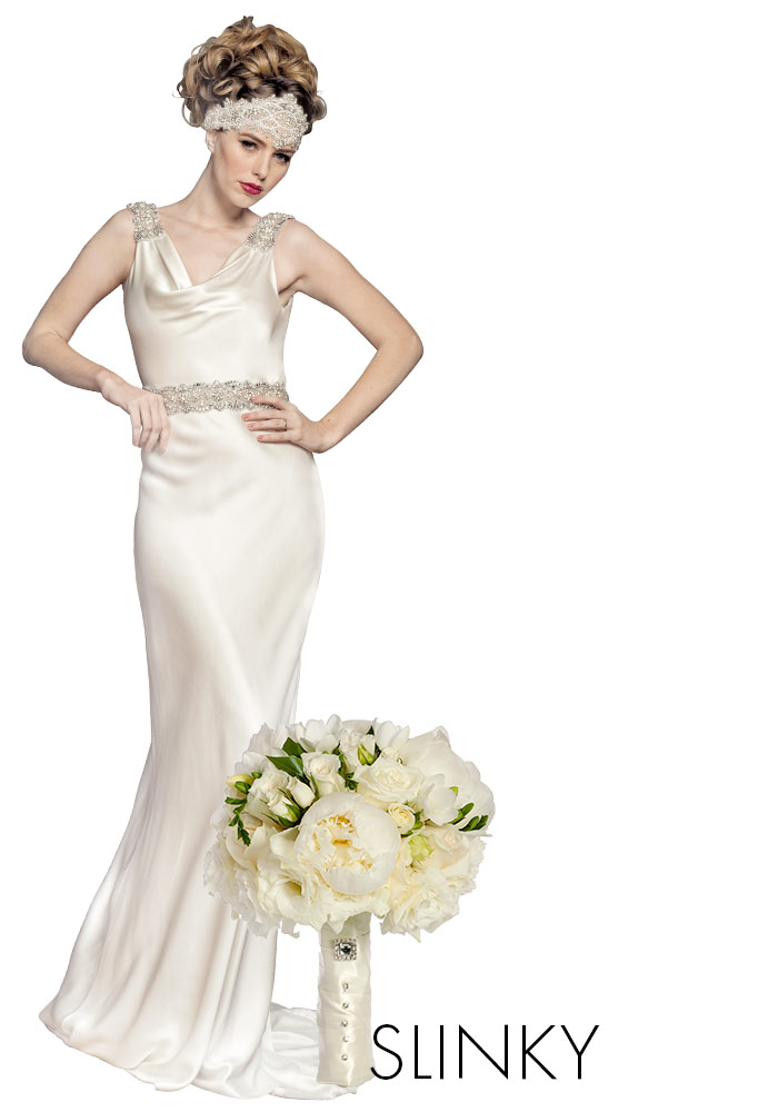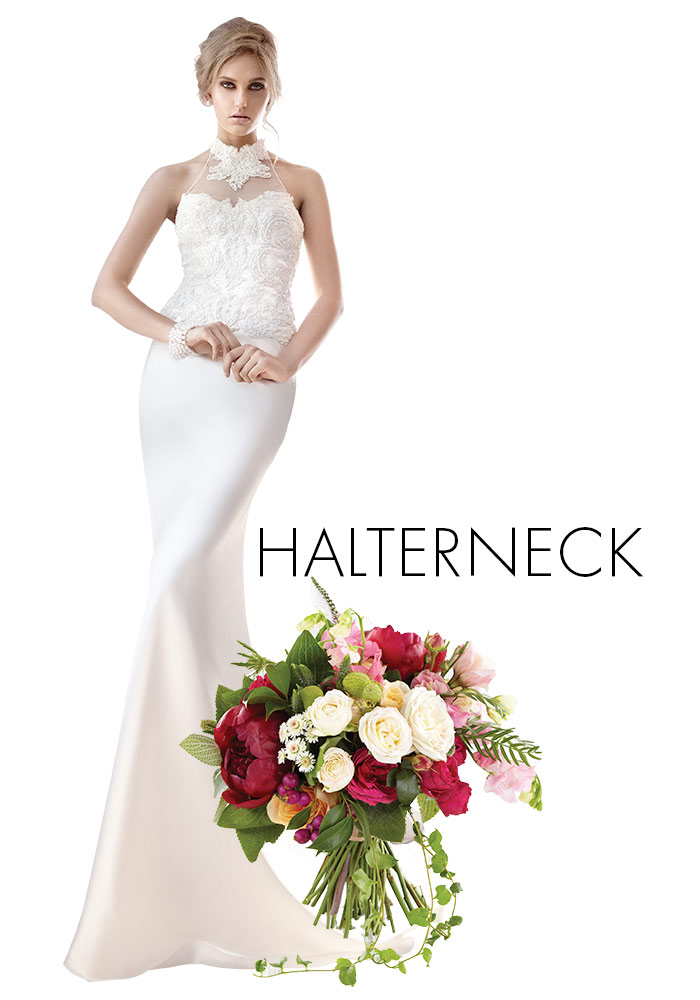 wedding dresses are all about fluid movement and clean lines. Reflect the unfussy lines with a long-stemmed bouquet that mirrors the slender silhouette and won’t detract from the detailing around the neckline.