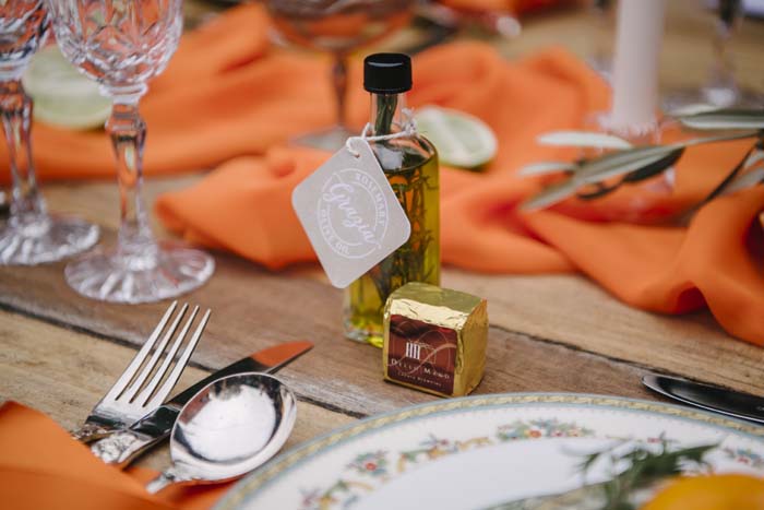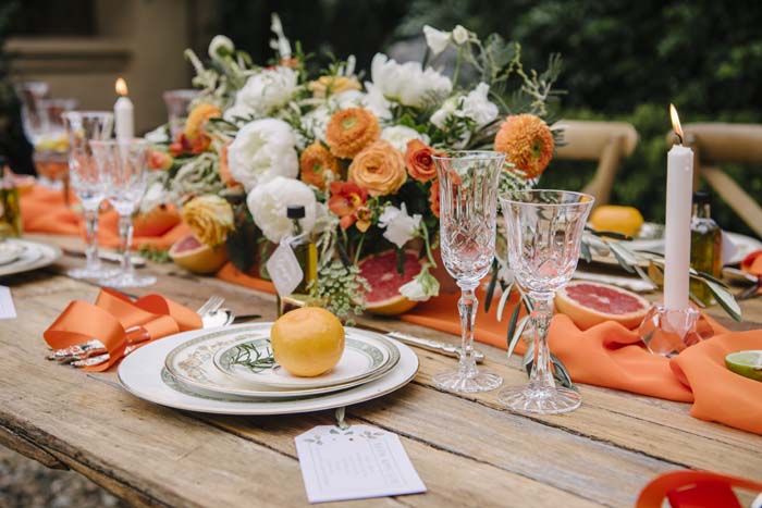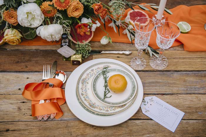 Drawing inspiration from fresh the natural beauty of Tuscany, stylist Alysia from Celebrations By Alysia creates a bright wedding atmosphere to pop against an Autumn landscape. “We love Tuscany and we really wanted to work with the colour palette of Tangerine, cream and silver green” says Alysia. “The rich terracotta and autumn foliage backdrop provided by The Brides Market was a stunning Tuscan combination for our styled shoot and tablscape.”