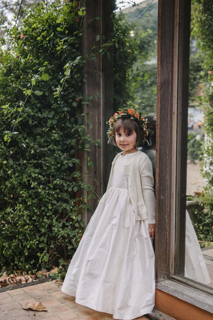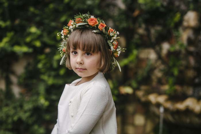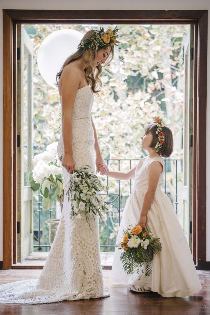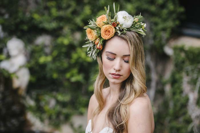 Fruits adorn the wedding tablescape and are paired with divine fresh floral arrangements to create an atmosphere that is not only a delight for the eyes, but will also emanate a wonderful citrus aroma at the table. The bride and adorable flower girl match the tuscan inspired wedding reception with their crisp white dresses and luscious flower crowns by Bella Bloom Floral Designs.