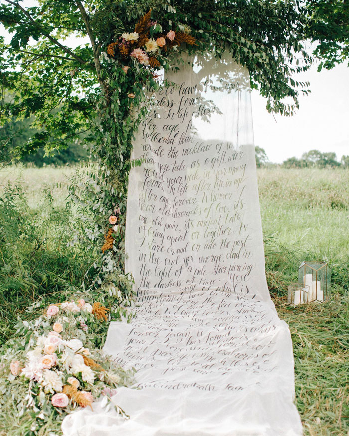 Every couple has that song that perfectly encapsulates their relationship or takes them back to a super sentimental moment every time they hear it. If you and your partner want your song to be part of your big day, make it the background of your ‘I do’ moment! Get the lyrics of your special song printed onto a delicate sheet to hang up as your ceremony backdrop.