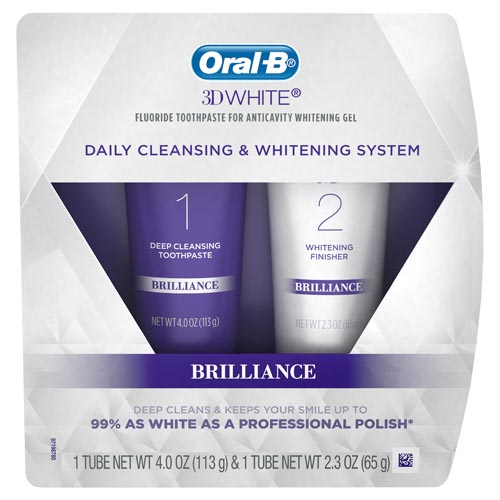 Just like a good skin care routine would consist of at least two steps, your smile can benefit from a similar approach. Oral-B 3D White Brilliance 2 Step System includes a deep cleansing toothpaste and a whitening finisher to keep your smile up to 99% as white as a professional polish.