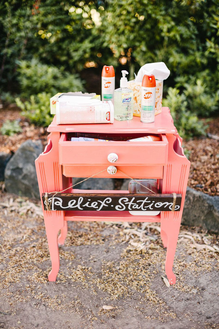 There’s nothing cute about bug bites, runny noses or grass stains on your outfit! At your wedding, be prepared for any situation by setting up a relief station that you and your guests can visit throughout the day. Equip your relief station with all the much-needed essentials like bug repellent spray, wet wipes and bandaids. Plus, don’t forget that during these times it’s also super important to stock your station with plenty of anti-bacterial hand sanitiser, tissues and disposable face masks!