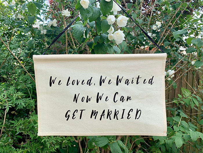 We love cute wedding signs and right now, there is possibly no sign more relevant than this one! For anyone who has had to postpone their wedding due to the pandemic, this particular sign will certainly ring true. Plus, it’ll be a super cute keepsake to remind you of your intimate lockdown wedding.
