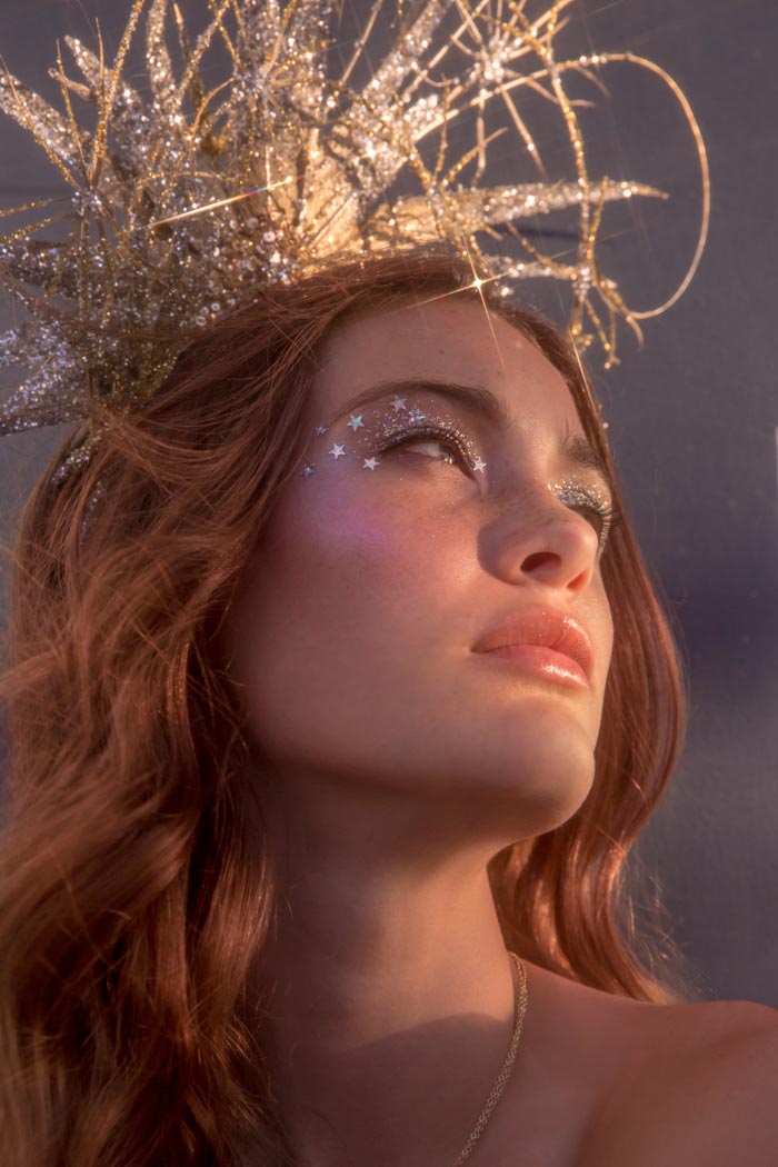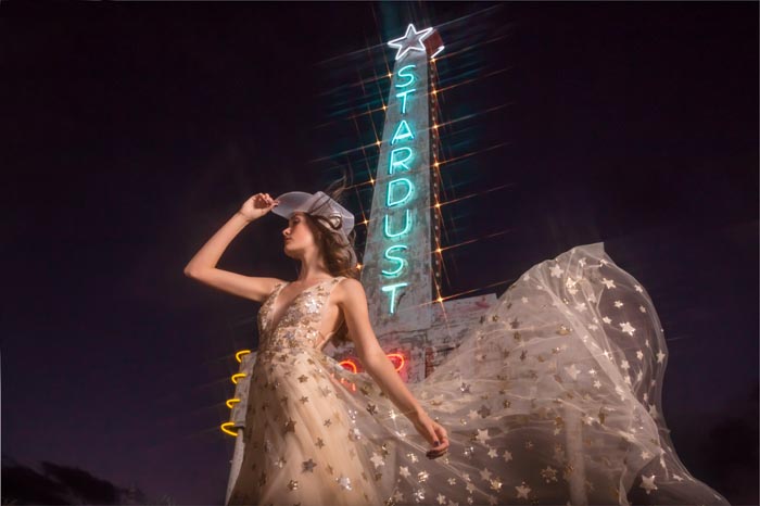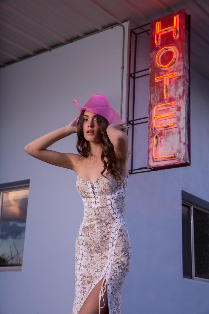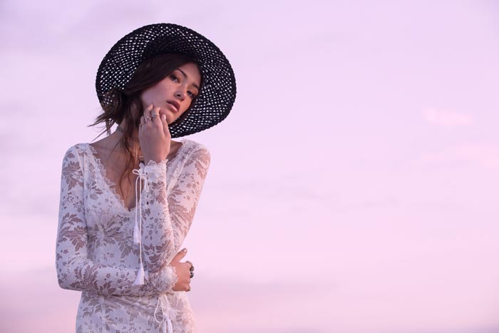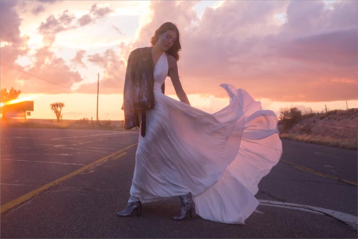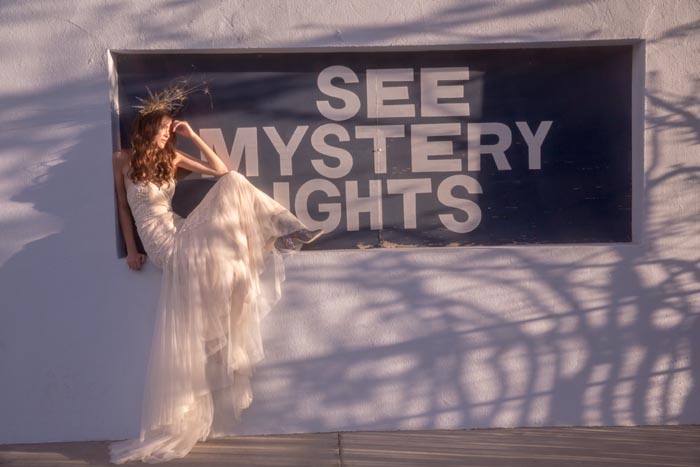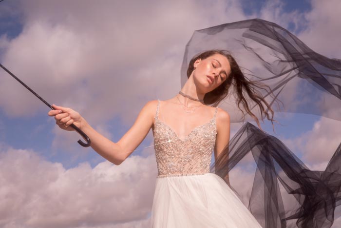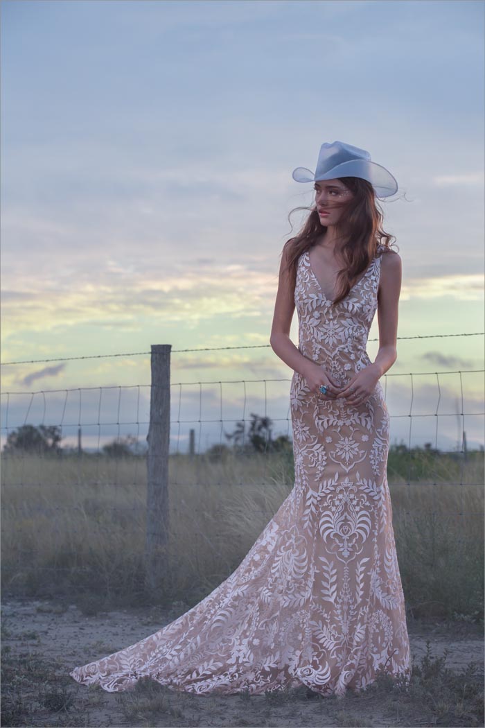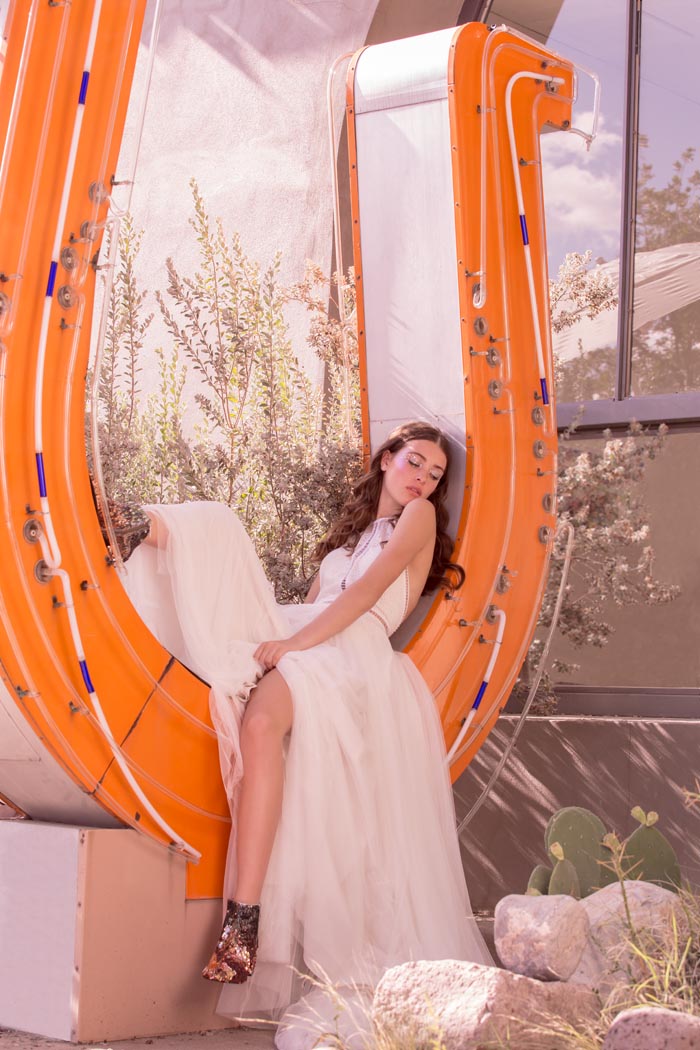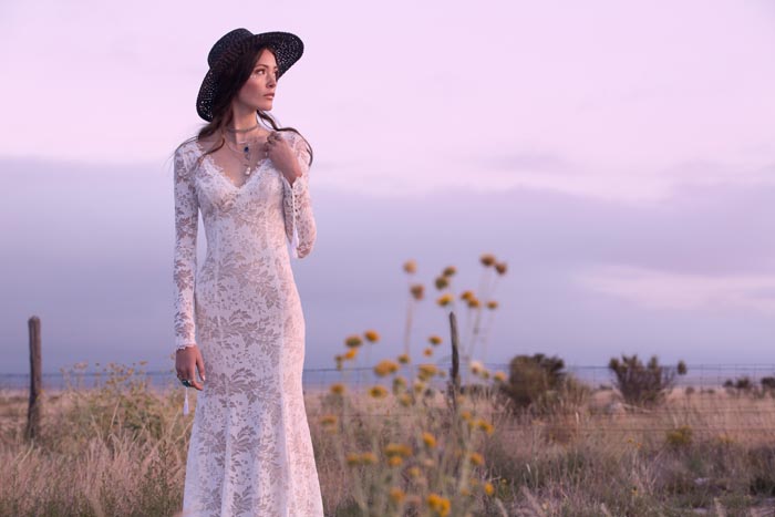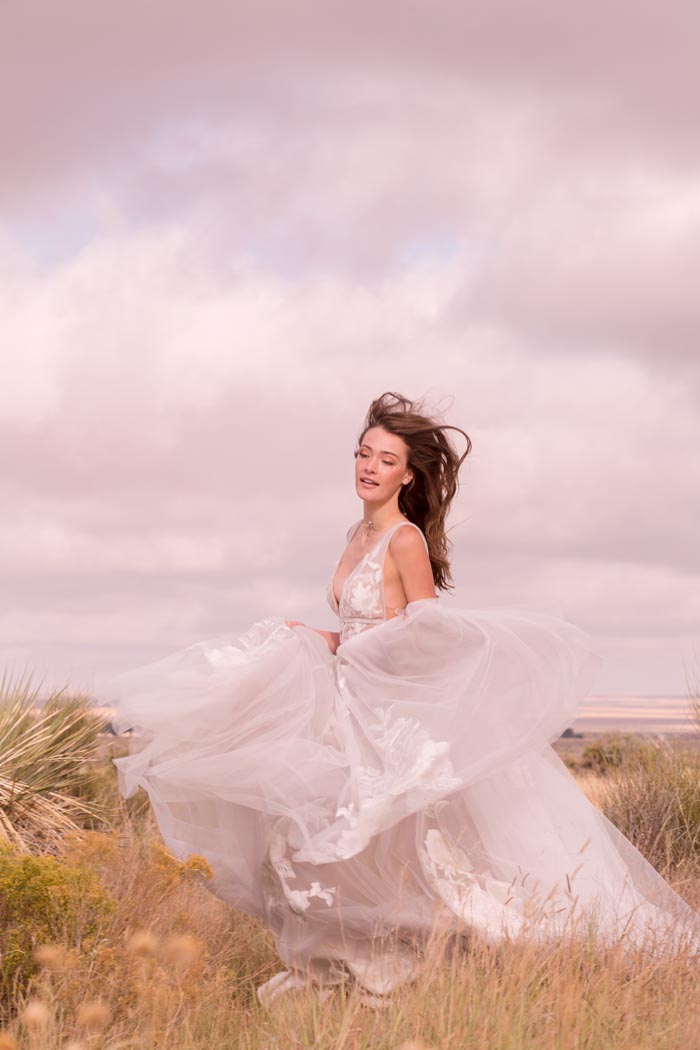 ‘Our romance with the moon and stars happily influenced the design direction for La Luna. We imagined brides in airy worlds glittering with light and promise. Big Sky Marfa, Texas felt like the quintessential place to shoot. There, surrounded by endless horizons, magnetic views of the Milky Way and perhaps a wink from alien lights, the high desert was just the kind of magic we were looking for,’ says the team at Willowby by Watters.