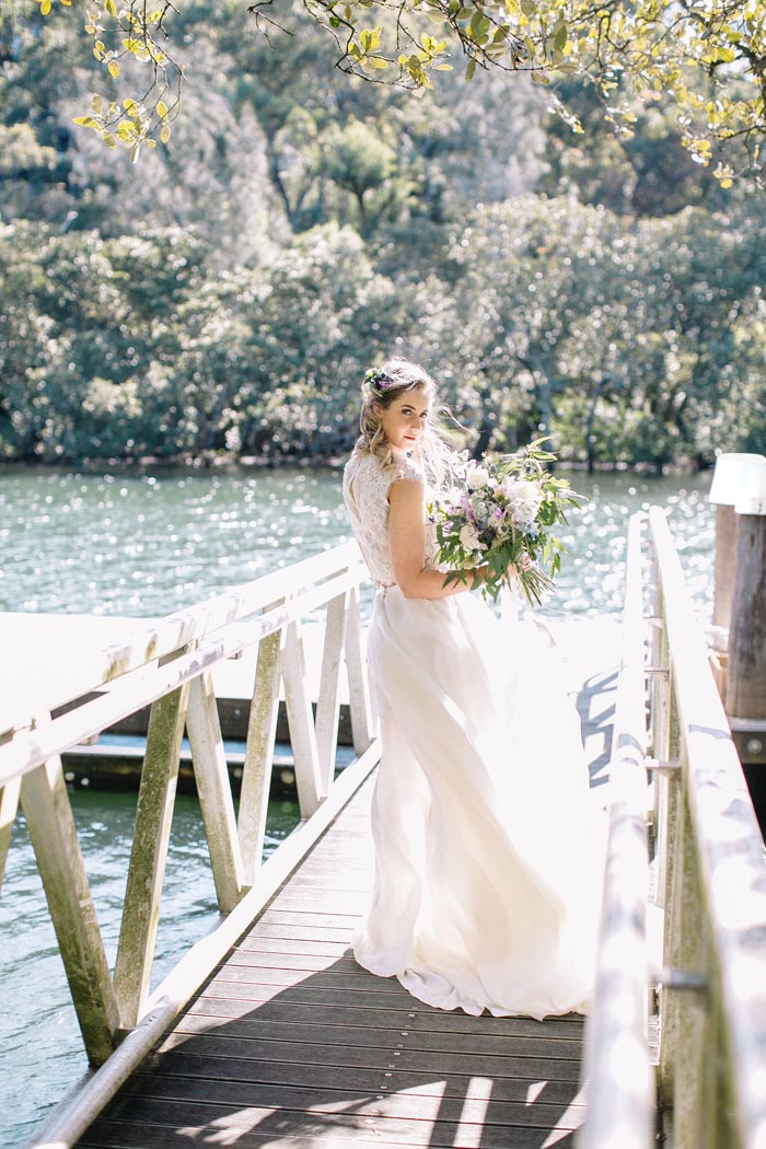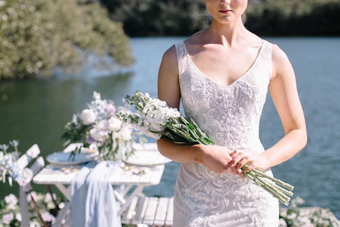 An intimate elopement set atop a jetty on a lake, this romantic styled shoot feels as though could be anywhere untouched by the outside world.
