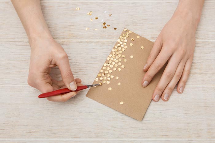 2. Stick the golden circles onto the envelope. You might try sticking them irregularly, in small intervals using tweezers.