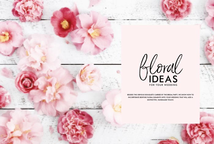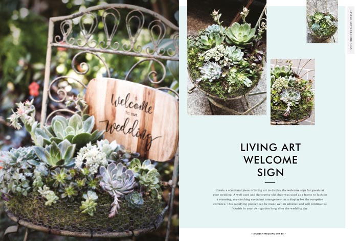 Floral inspiration is covered with a living art succulent wedding sign; a gorgeous floral crown for your flower girl; and how to dry your own petal toss and make heartfelt boutonnieres for the groom and his men (from page 70).