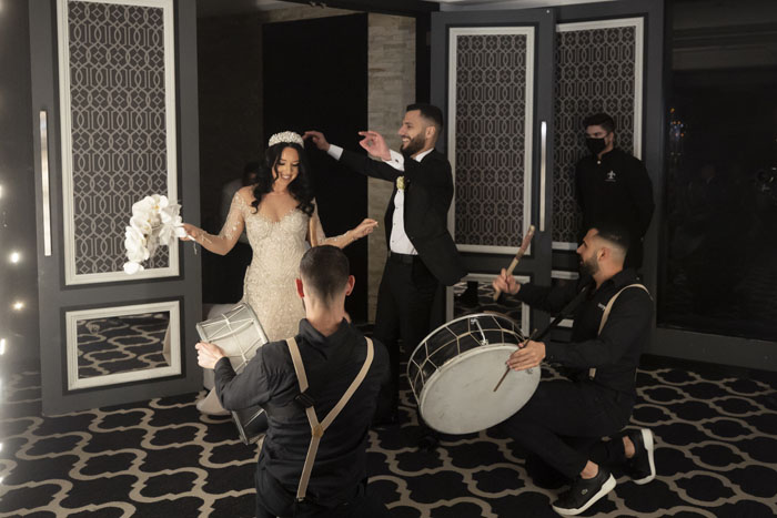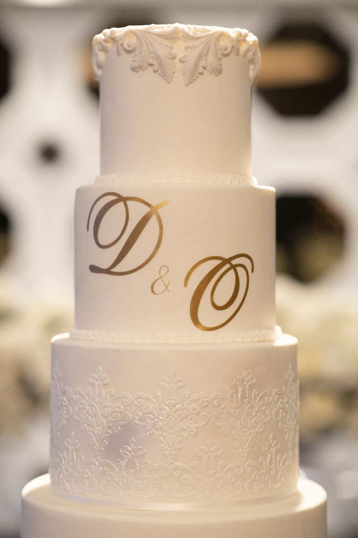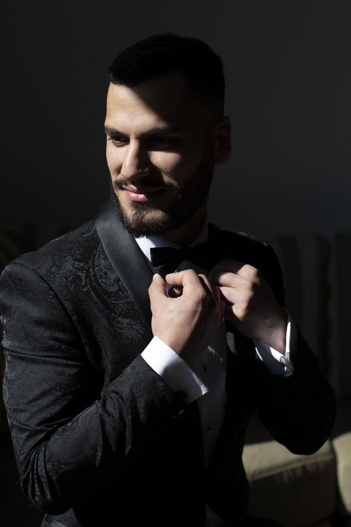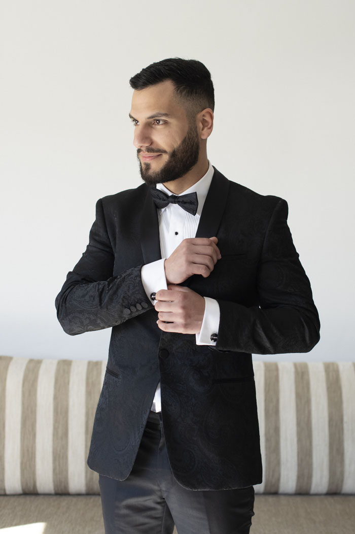 Olivia wore an elegantly detailed nude and silver beaded gown designed by Micheline Mokdassi. Micheline’s uniqueness, creativity, and attention to detail are what brought the design to life. Olivia’s gown exuded luxury and modern-day essence, from the intricate Swarovski beading and detachable overskirt to the dramatic sleeves and sheer backless design secured with traditional back buttons. The dress was the result Micheline designed drawing inspiration from 5 wedding gowns that Olivia had presented when they were sketching her dream wedding gown. Dom was dressed in a traditional black tuxedo with a patterned blazer to complement Olivia’s gorgeous gown and was finished off with stylish black cufflinks.