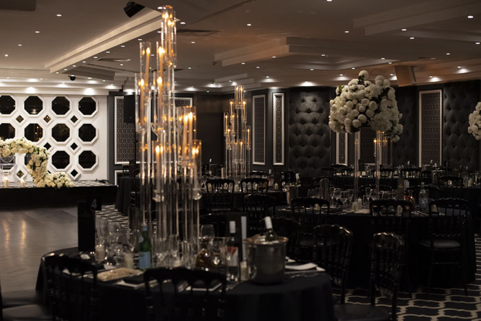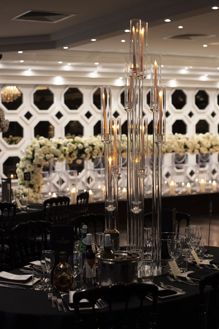 The lavish reception was held at Doltone House, Sylvania Waters. The room was filled with fresh white florals and extravagant crystal candleholders on each table which looked spectacular against the dark features of the room. Each table was styled alternatively with a combination of acrylic floral stands and stylish candle holders as the centrepiece, with black linen tablecloths and black chairs as an offset. The main feature of the room was the long head table accommodating the wedding party towards the back of the room. The table and chairs were a clear style which exaggerated the stunning bright white florals and candles displayed along the whole length. The show-stopping 7 tiered cake, decorated white and with gold calligraphy of their initials and date took centre stage on an acrylic table with an orchid feature.
