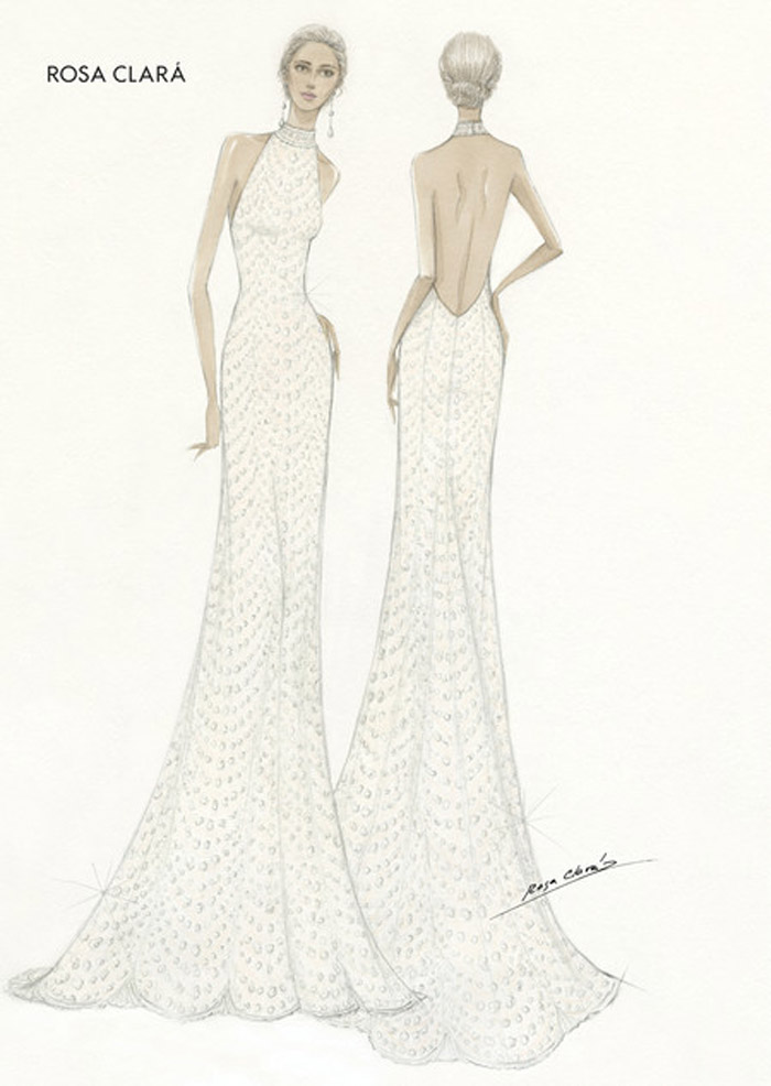 Mery debuted a second bridal look later on in the day which was also designed by Rosa Clará. The bride’s second dress featured a backless Chantilly lace halter top, scalloped flower motifs and transparent micro beading on hand-embroidered fabric for a look that was all kinds of elegant.