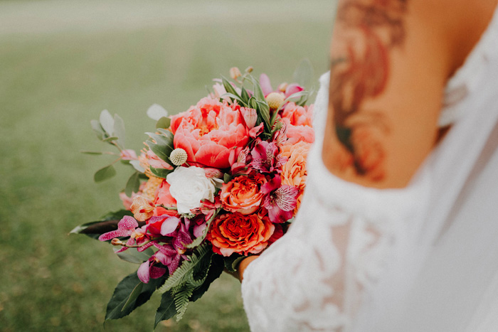 This gorgeous bridal bouquet featured at Ashley and Byron’s colourful coastal celebration in Hawaii