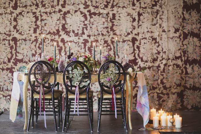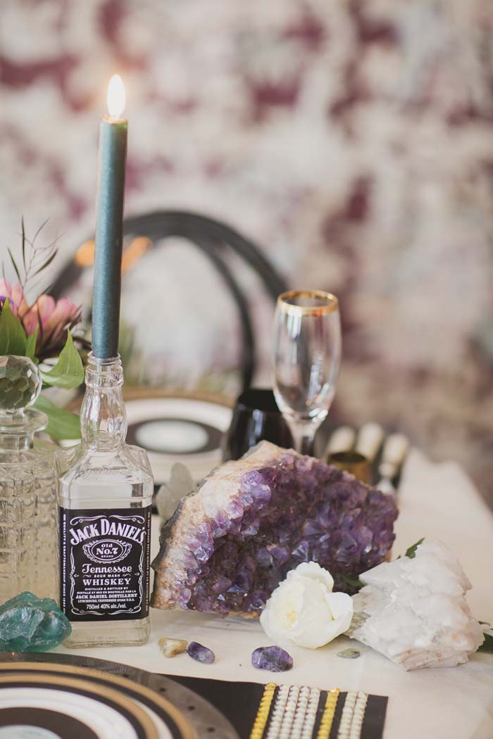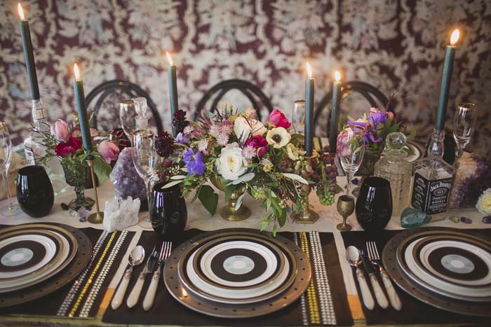 Saturated with an edgy, energetic palette of black, gold hothouse violet, vibrant fuschia and lush green, it positively radiates #cool fervor and good vibes. On the table, empty Jack Daniels bottles become candlestick holders and amethyst crystals sit side by side with specially studded black linen and animal skulls.