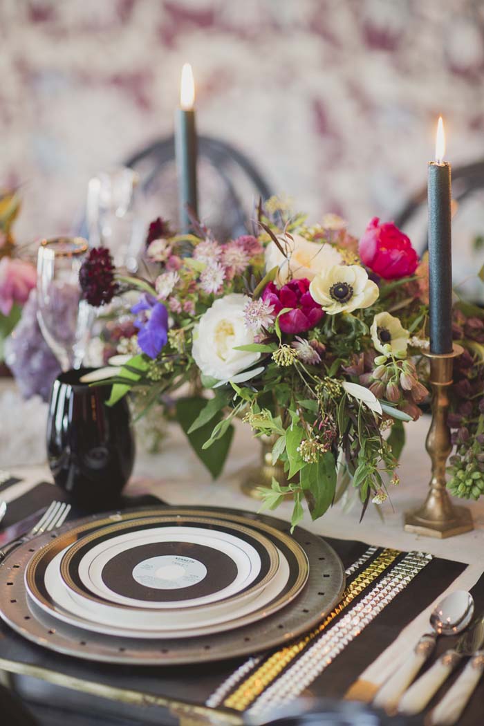 Original look vinyl 45s form the perfect rock and roll place cards, with each guests name and the menu printed in the style of an artist and song listing.