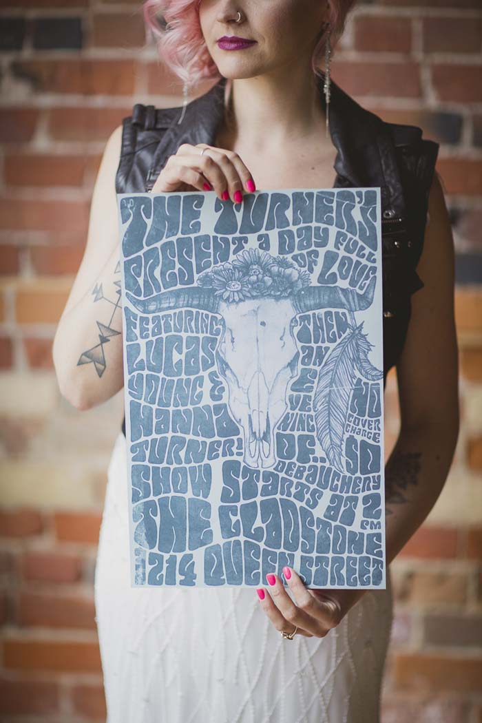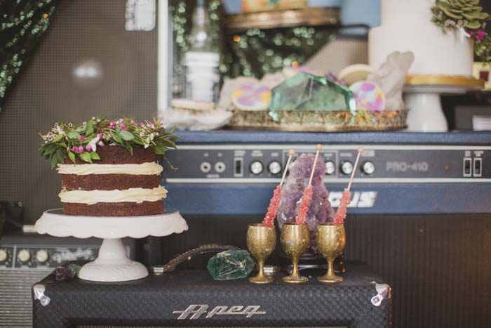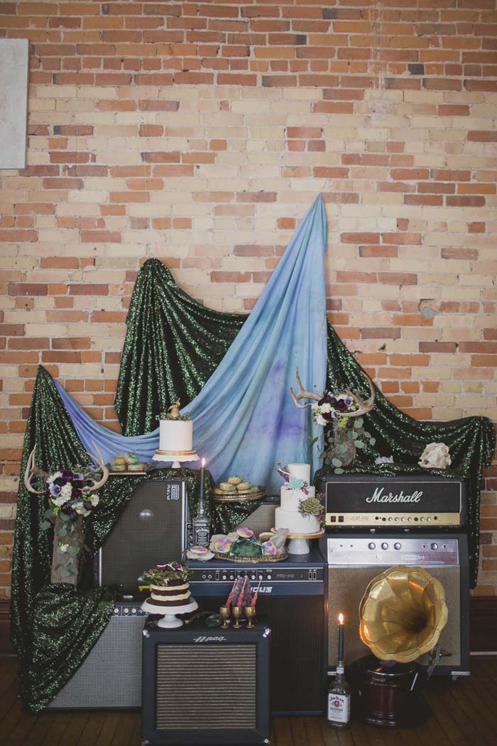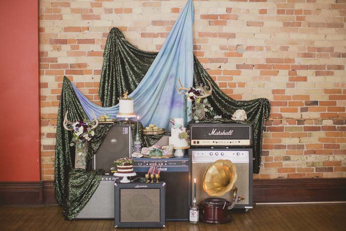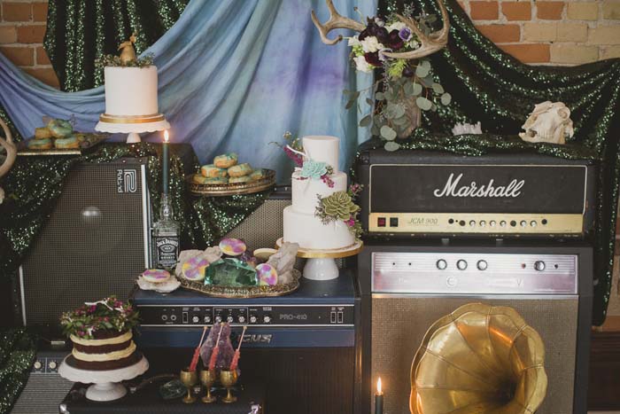 The most rocking candy buffet you’ll ever see sits atop vintage guitar, brass and keyboard amps and features mix of fun and more classic dessert designs. The rock and roll bride pairs leather and lace, fur and tulle, and simple cotton with statement jewellery and a hot-pink beauty look.