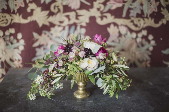 Black chairs are given personality with with hand-tied posies of foliage and flowers, each one completely different. Wild, unstructured florals combine roses, daisies and tulips with hyacinth and tumbling foliage for a moody, yet spirited aesthetic. Rough, worn antiques add a touch of vintage style when paired with vibrant, fanciful florals.