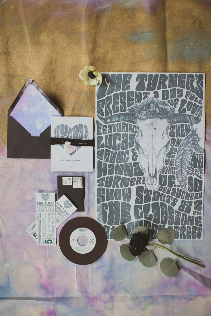 Imbued with the visual components of music in the 1970s and a colour palette that reflects both classic rock sensibilities and free-loving hippe style, this setting united textures like leather, studs, and tie-dye fabric with rustic wood, crystal, vinyl and brass.